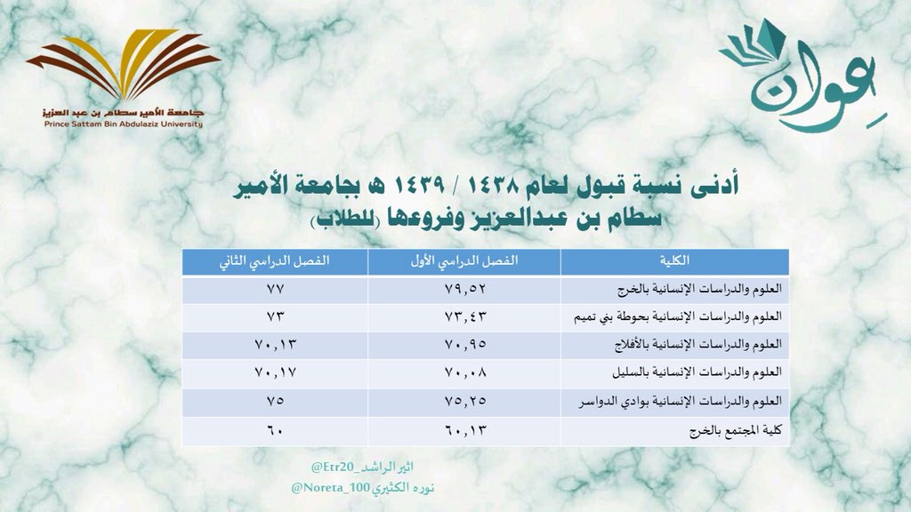 السبت 11 يوليو 2020 22 01. أدنى نسب القبول للطالبات بجامعة الأمير سطام بن عبدالعزيز للعام الجامعي 1438 1439هـ السنة التحضيرية للطالبات بالخرجأدنى نسبة قبول للفصل الأول. أدنى نسبة قبول للفصل الأول. تعلن عمادة شؤون القبول والتسجيل بجامعة الأمير سطام بن عبدالعزيز عن أدنى نسب القبول للطلاب والطالبات للعام الجامعي 1442هـ وهي على النحو التالي ادنى نسب القبول للطلاب والطالبات للعام الجامعي 1442هـ.