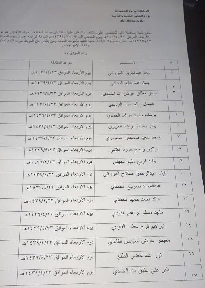 بلدية محافظة أملج Twitterren تعلن بلدية أملج لعموم المتقدمين على وظائفها التي تم الإعلان عنها سابقا أنه تحدد موعد المقابلات الشخصية وذلك حسب البيان المرفق المحدد فيه الأسماء ويوم المقابلة فعلى الجميع