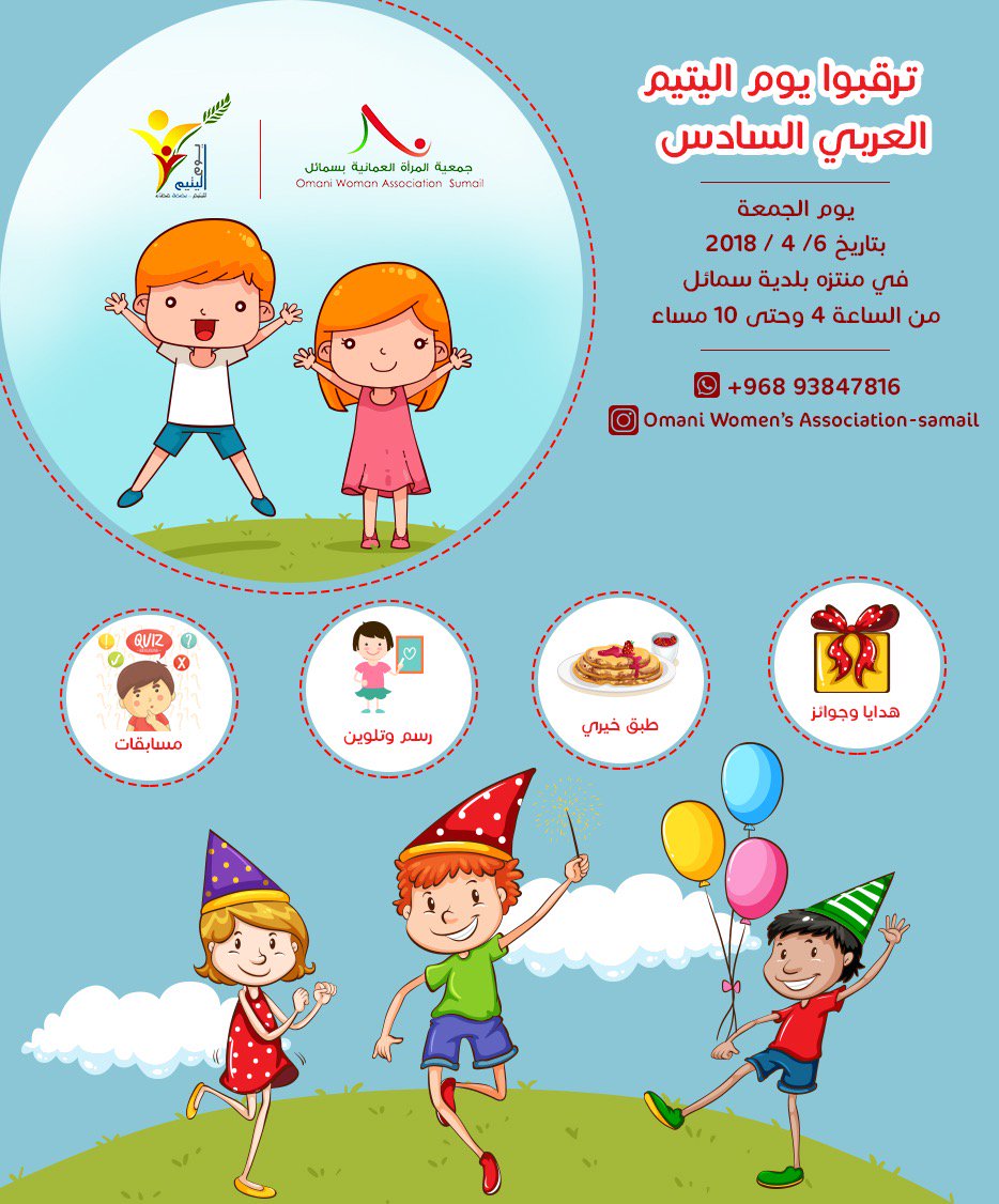 موسى الحراصي On Twitter نحن بانتظاركم في فعالية يوم اليتيم السادس تنظيم جمعيةالمرأة العمانية بسمائل وذلك بتاريخ 6 4 2018 مساء الجمعة بإذن الله بمشاركة العديد من الفرق التطوعيةوالخيرية وهناك الكثير من البرامج المنوعة